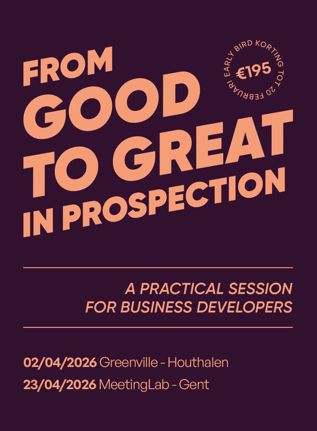Prospectie is moeilijker dan ooit. Beslissers zijn sceptisch, inboxen vol en kanalen verzadigd. Het resultaat? Minder respons, meer frustratie en vaker de vraag: “Ligt het aan mij?” Maar: je bent niet alleen. Daarom organiseren we “from good to great in prospection”: een praktische, interactieve namiddag door én voor business developers. Boordevol inzichten, herkenning en vooral: succesrecepten die vandaag werken. Geen grote strategieverhalen, maar concrete formats, peer-to-peer sparring en tactieken die je de dag nadien meteen gebruikt!